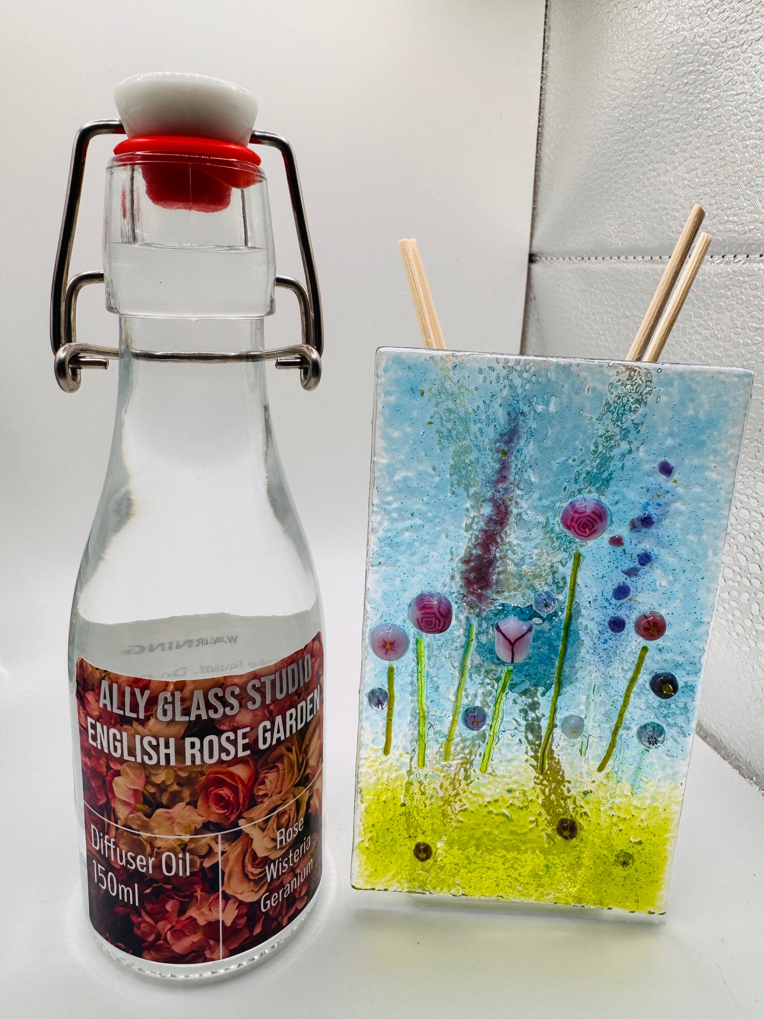 Handmade fused glass panel with 3d garden flowers 3d detail measuring approximately 12cm x 7cm attached to a glass diffuser bottle with natural reeds.