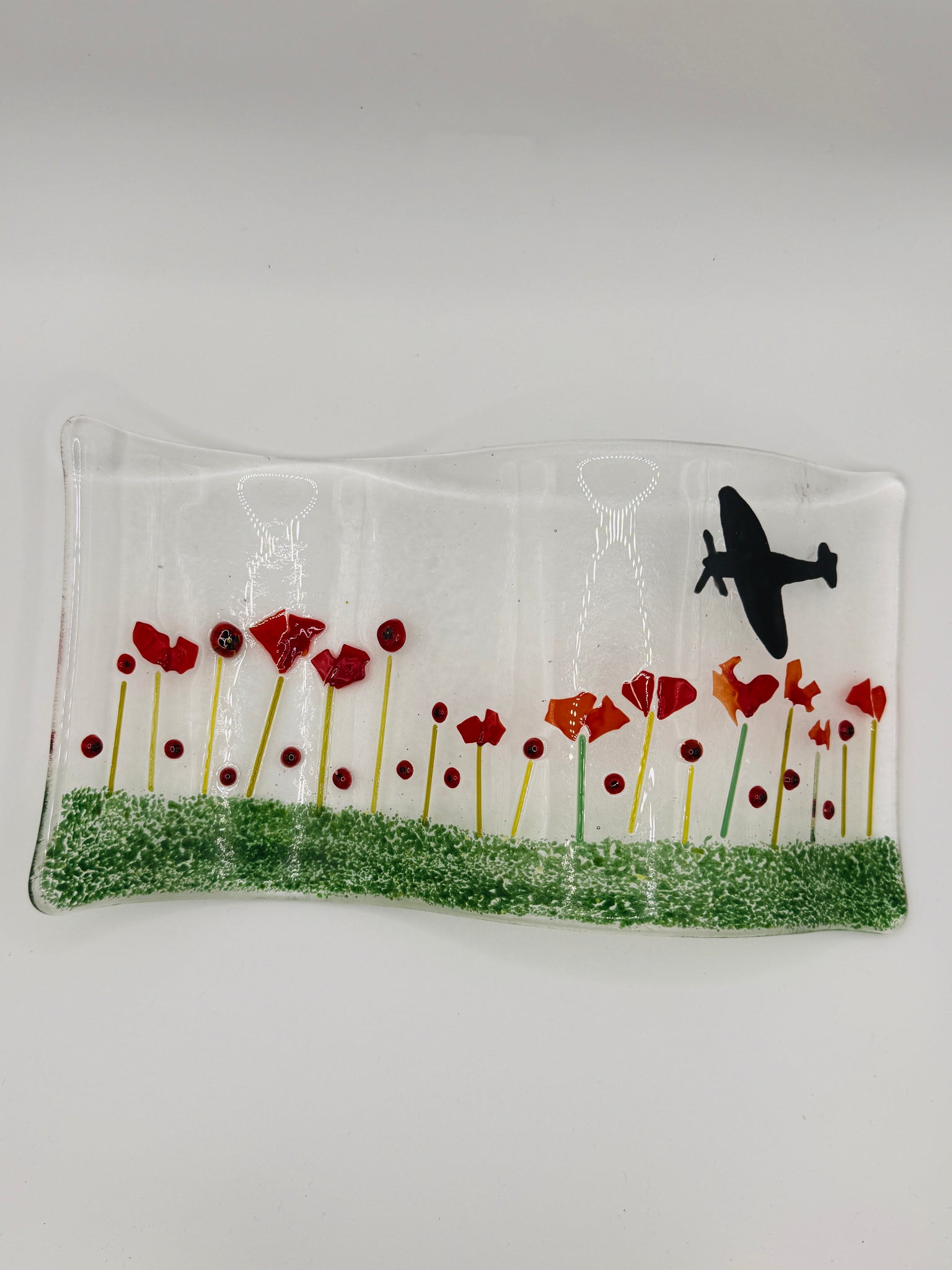 Handmade self standing fused glass spitfire remembrance with 3D poppies measures approx 13cm x 23cm
