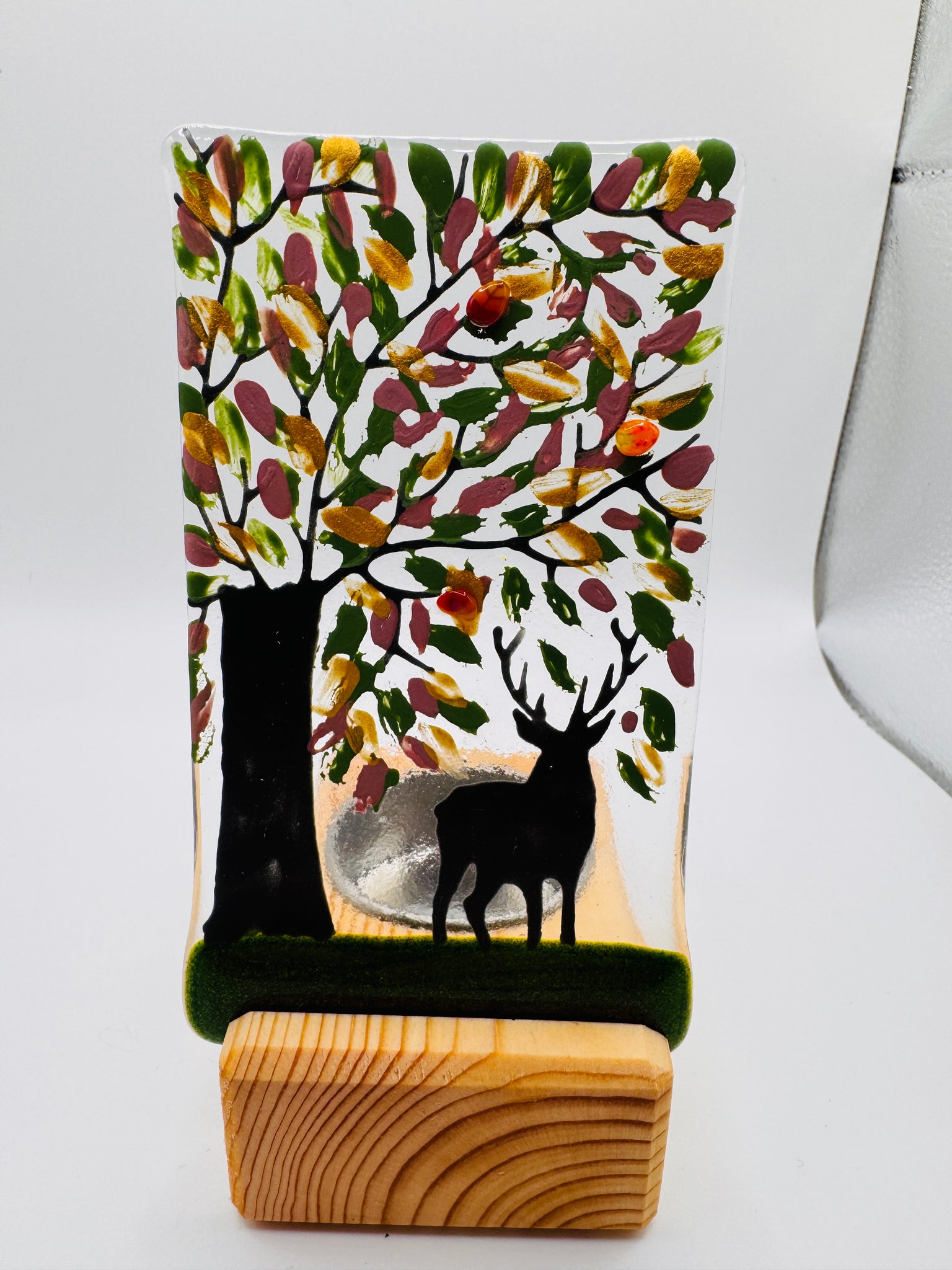 Handmade fused glass panel with Autumn tree and stag detail and 3d blossom. The panel measures approximately 12cm x 7cm. The panel slots onto a handmade pine wooden tealight holder with metal tealight inlay. The wooden stand measures 8cm x 5cm x 3cm.