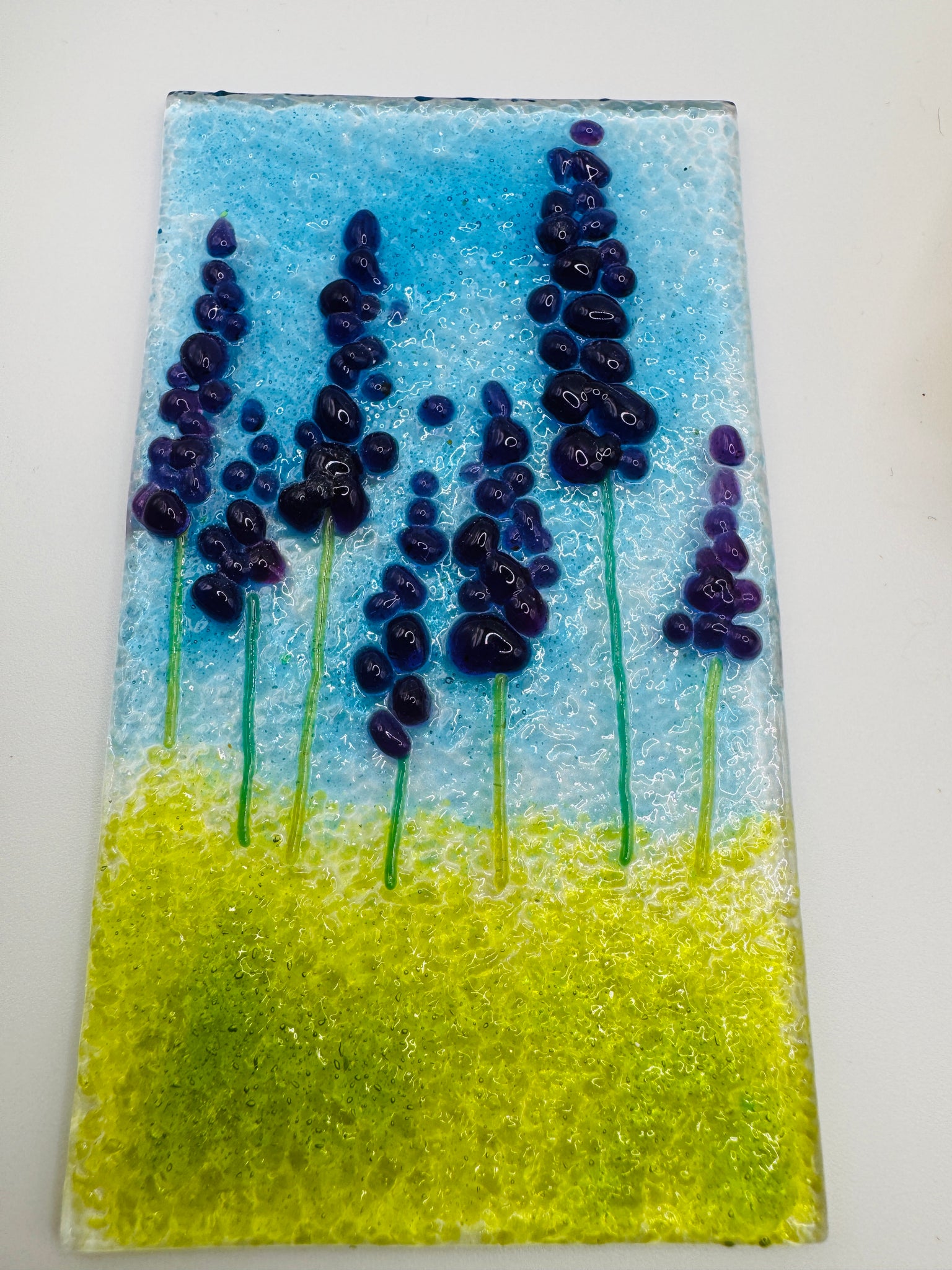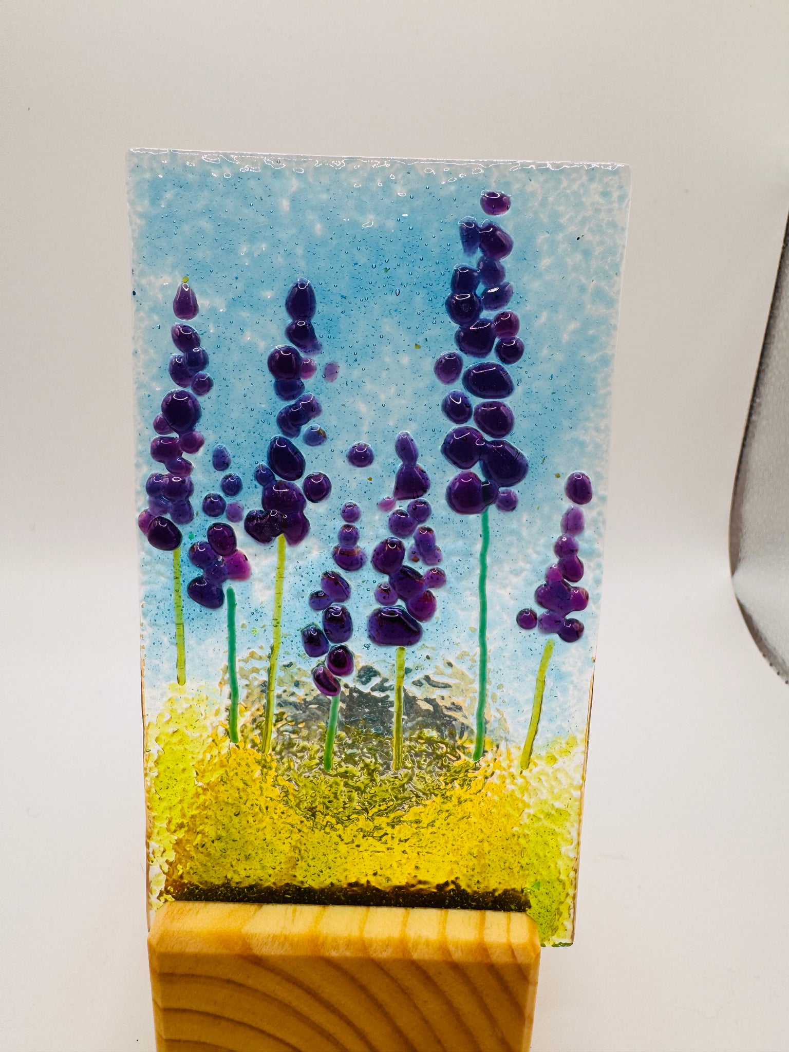 Handmade fused glass panel with 3d flower detail . The panel measures approximately 12cm x 7cm. The panel slots onto a handmade pine wooden tealight holder with metal tealight inlay. The wooden stand measures 8cm x 5cm x 3cm.