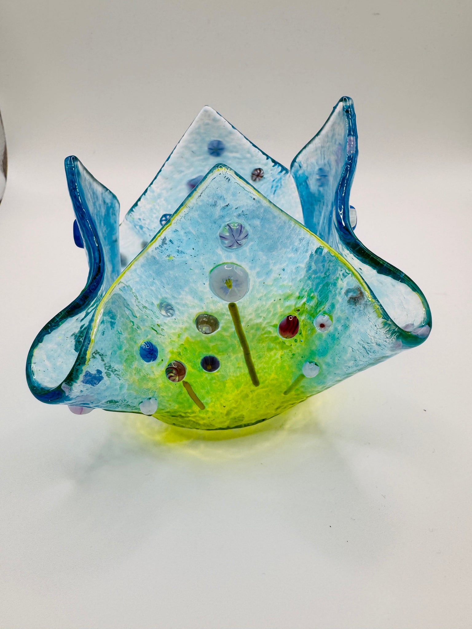 Handmade fused glass Teadlight holder with meadows flower detail on all sides measures approximately 10cm wide by 8cm tall