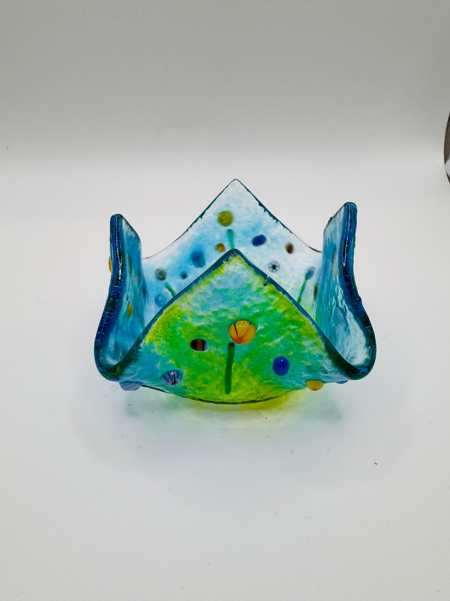 Handmade fused glass Teadlight holder with meadows flower detail on all sides measures approximately 9cm wide by 5.5cm tall
