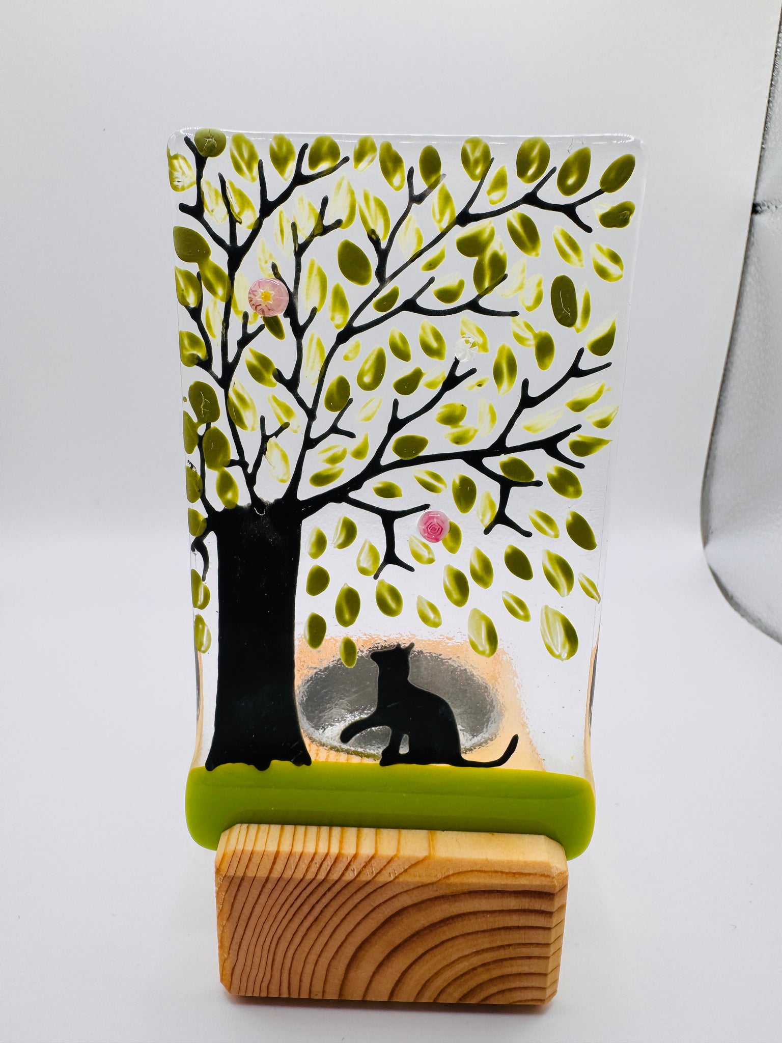 Handmade fused glass panel with cat and spring tree detail and 3d blossom. The panel measures approximately 12cm x 7cm. The panel slots onto a handmade pine wooden tealight holder with metal tealight inlay. The wooden stand measures 8cm x 5cm x 3cm.