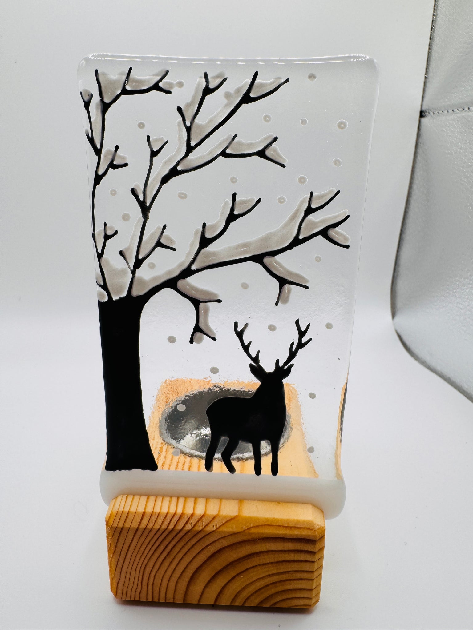 Handmade fused glass panel with winter tree and stag detail and 3d blossom. The panel measures approximately 12cm x 7cm. The panel slots onto a handmade pine wooden tealight holder with metal tealight inlay. The wooden stand measures 8cm x 5cm x 3cm.