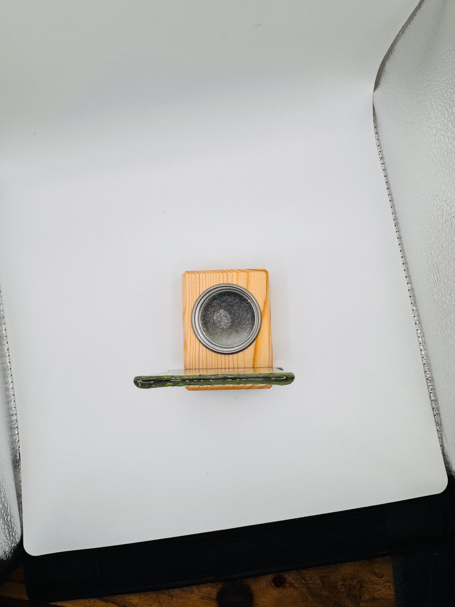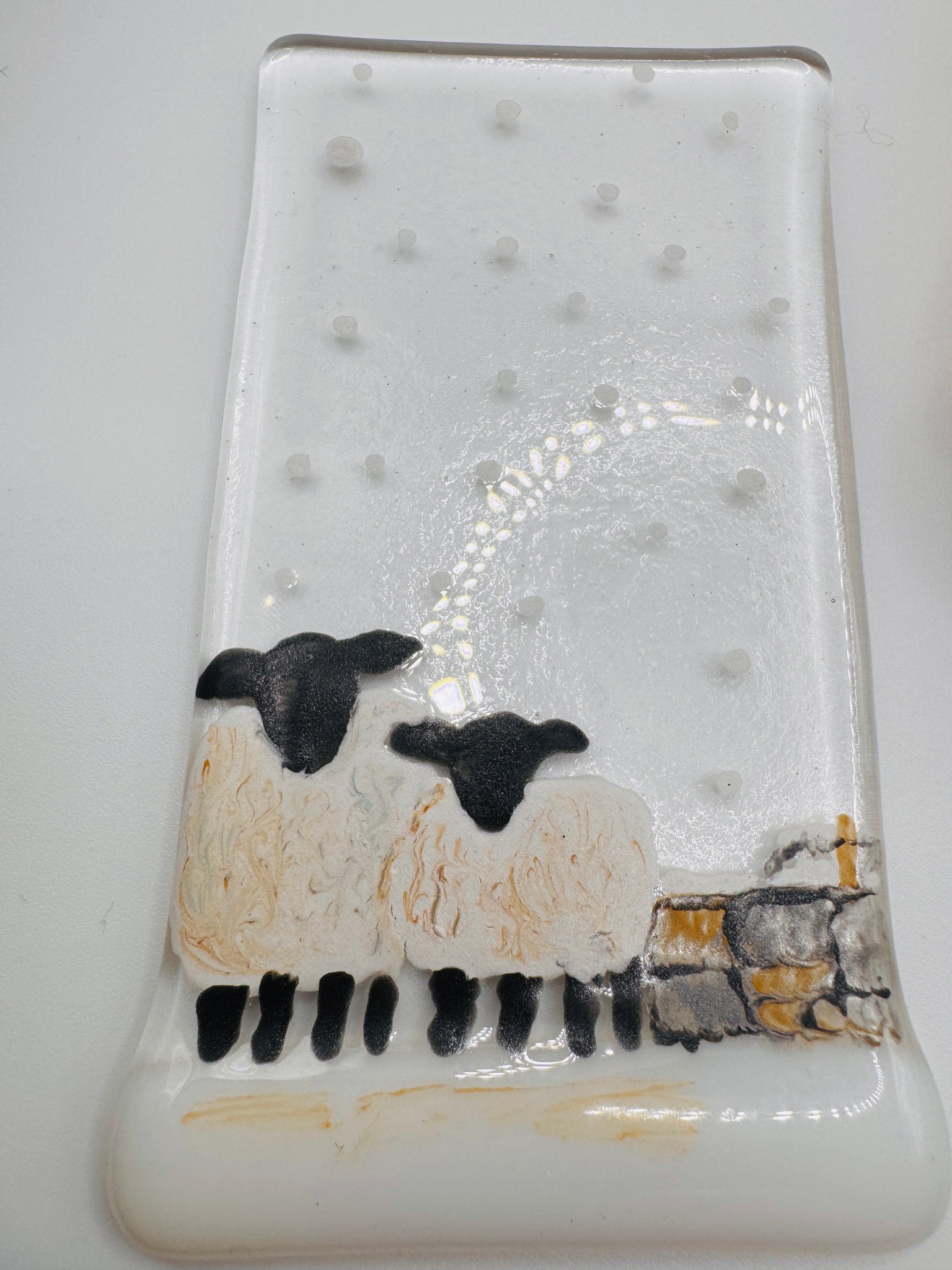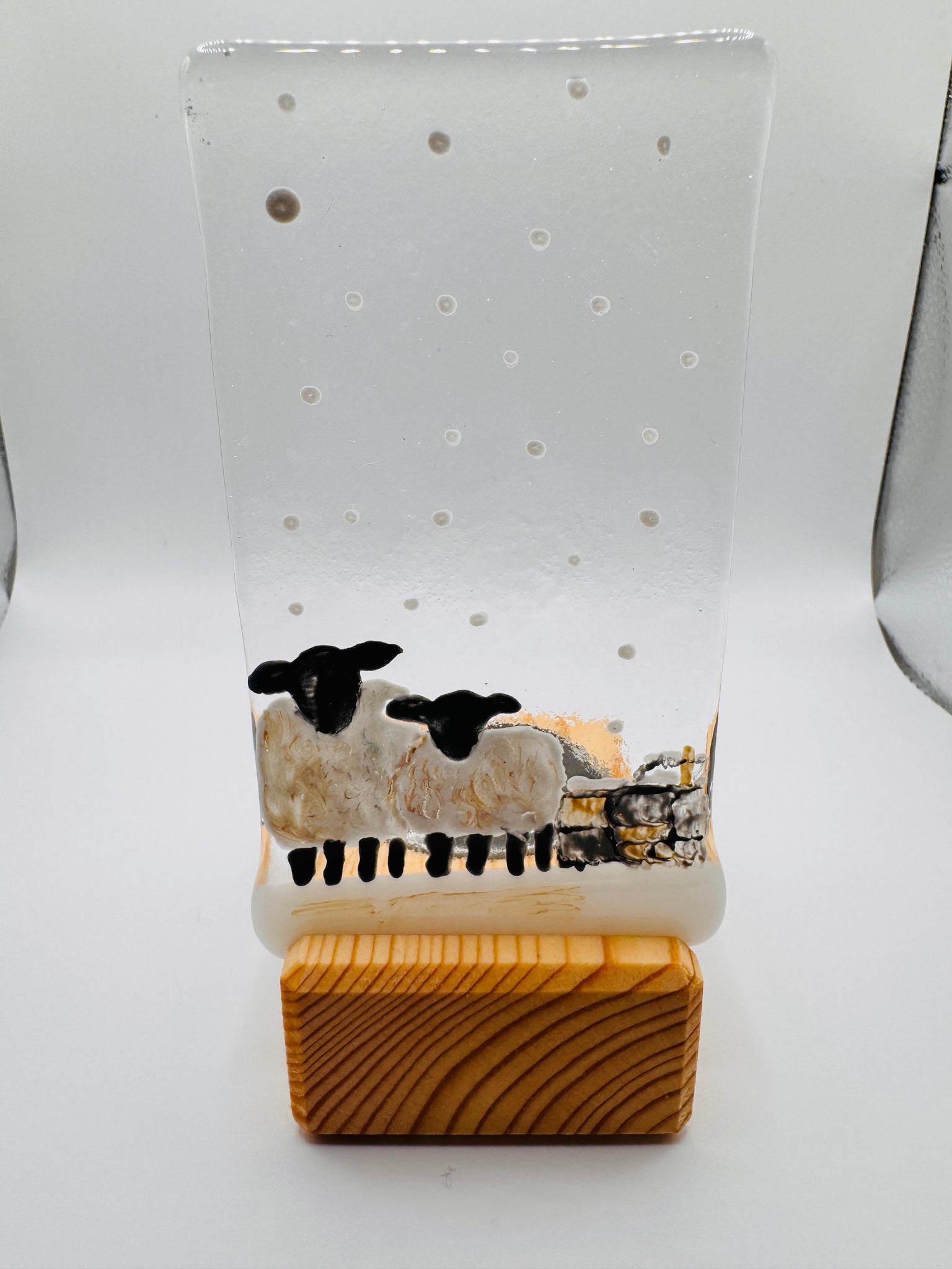 Handmade fused glass panel with winter sheep and wall detail The panel measures approximately 12cm x 7cm. The panel slots onto a handmade pine wooden tealight holder with metal tealight inlay. The wooden stand measures 8cm x 5cm x 3cm.